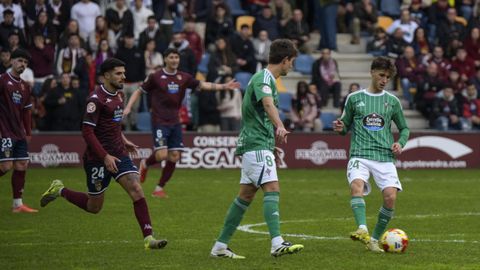 Muy vertical el Racing gracias al lucense, que quiso filtrar un pase a Giménez. No llegó el ilicitano. Dominan los ferrolanos y aguarda el Pontevedra, que es muy vertical y necesita pocos pases para finalizar jugada.