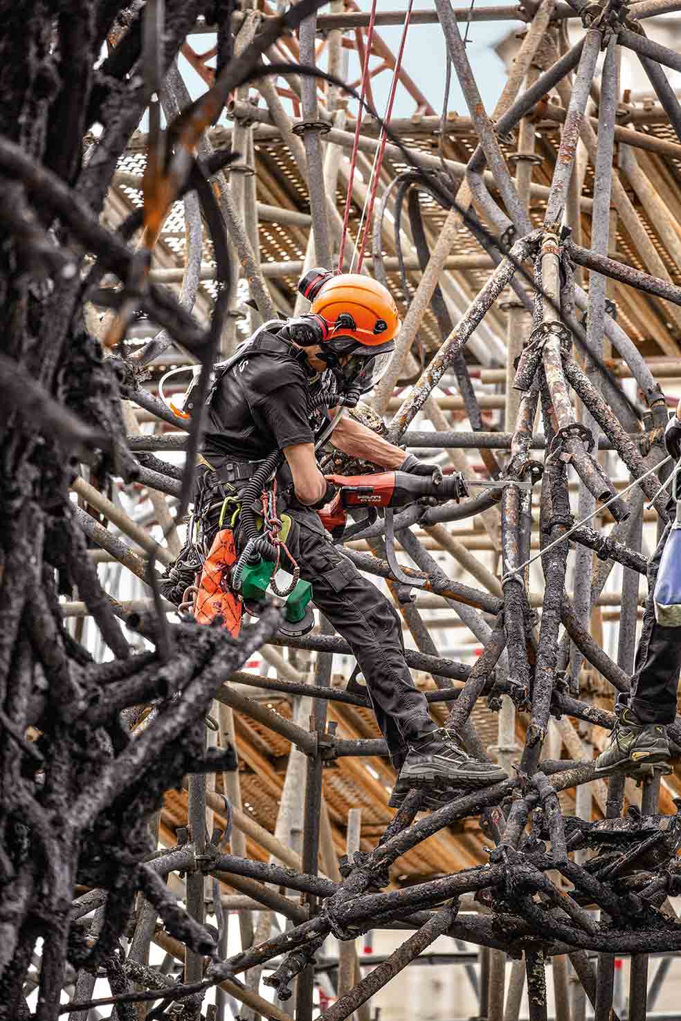 Fueron los encargados de desmantelar un inmenso bosque de andamios de acero en la nave central de Notre Dame, a veces jugándose la vida a grandes alturas y en posturas imposibles. Por eso los llamaron 'las ardillas'. Empezaron su labor en 2020, un año después del incendio. Ahora, gracias a ellos, la catedral está salvada.
