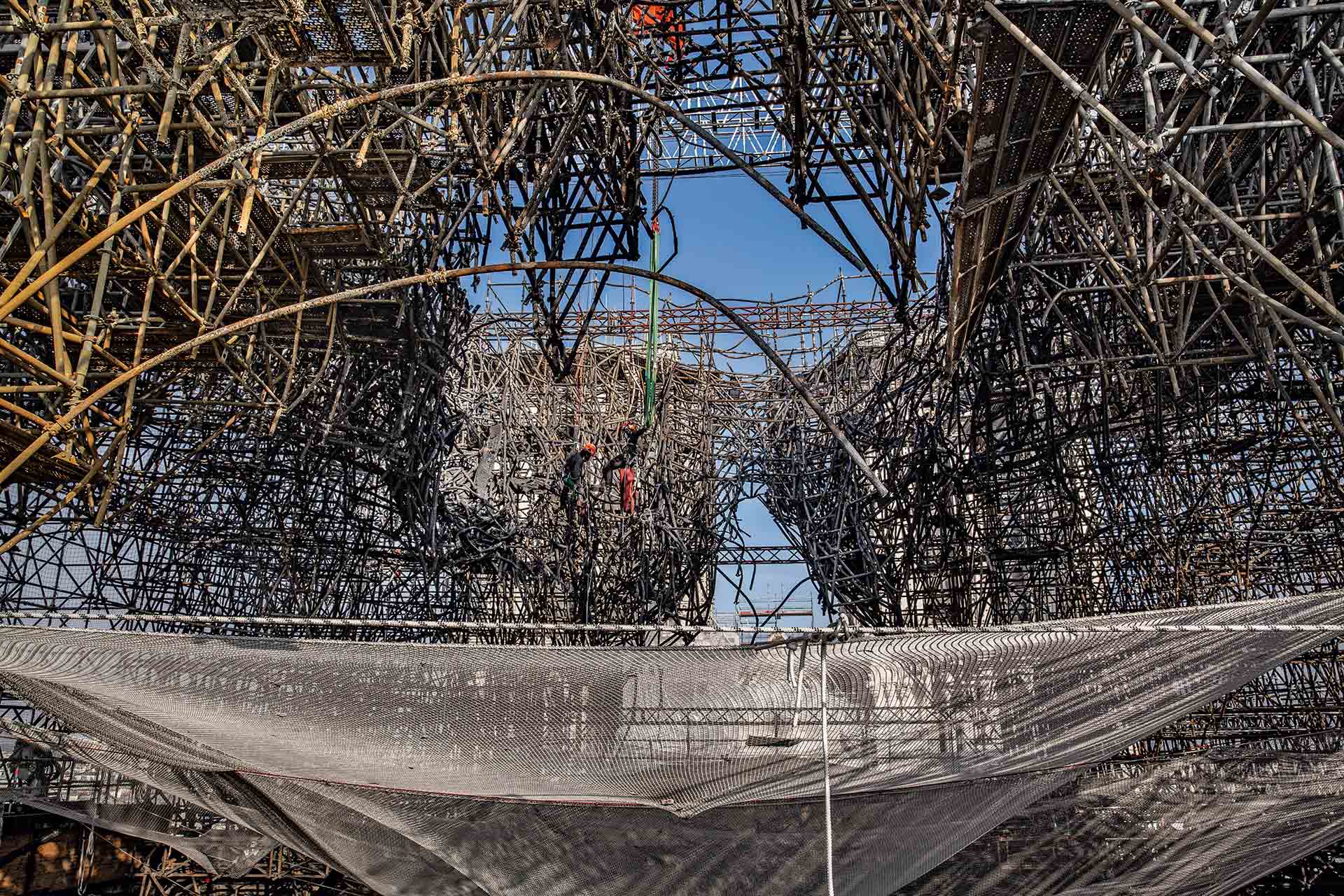 Eran 40.000 tubos. Doscientas toneladas de acero. El 15 de abril de 2019 el andamiaje estaba listo para iniciar las obras de renovación de ... la icónica aguja del templo. Ese día, las llamas se comieron el techo, la flecha se hundió y parte de la bóveda quedó destruida. El andamiaje se convirtió en un amasijo de cilindros doblados y soldados. Retirarlo era el mayor desafío de toda la obra de recuperación. Y para ello, desde el 8 de junio de 2020, diez hombres de Jarnias –una empresa especializada en trabajos de altura– se jugaron la vida a diario en el corazón de Notre Dame.