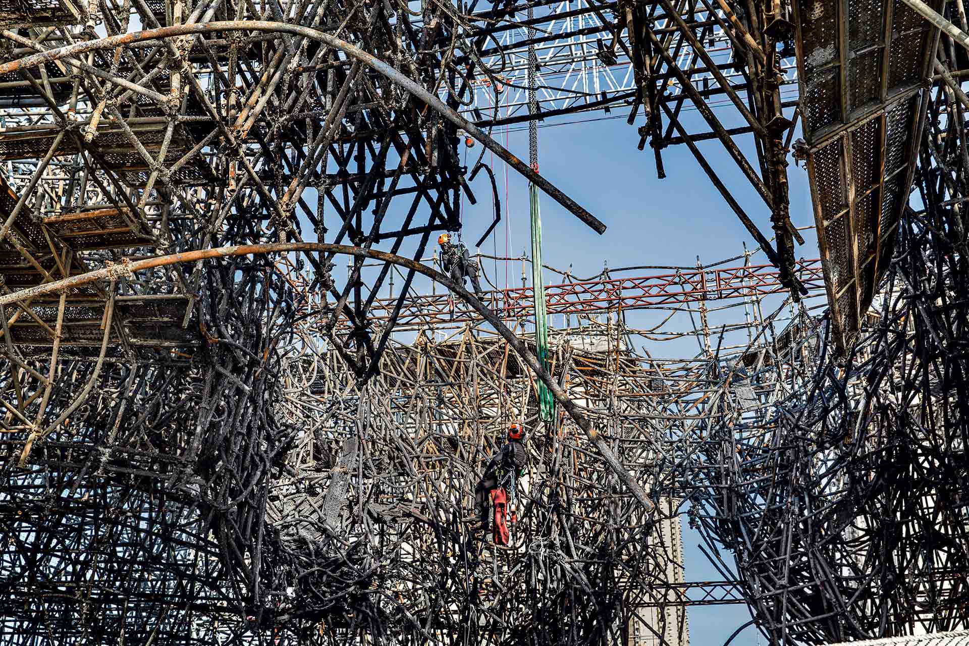 La estructura de Notre Dame por fin no corre peligro. Tres años después de incendio del 15 de abril de 2019, cuyo origen y responsabilidad no han podido establecerse, se ha iniciado una segunda fase menos arriesgada y centrada en la restauración de las bóvedas, que se prolongará hasta 2024. Pero hasta aquí, ha habido que esquivar numerosos potenciales desastres. El proceso más delicado fue la retirada de las 40 mil piezas del andamio que se estaba usando para restaurar la aguja cuando se declaró el incendio. Desmembrar ese amasijo de hierro fundido fue la labor de un equipo de especialistas que ya se han garantizado, por lo menos, una anotación a pie de página en los libros de historia.