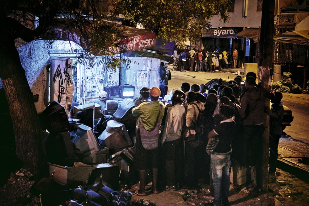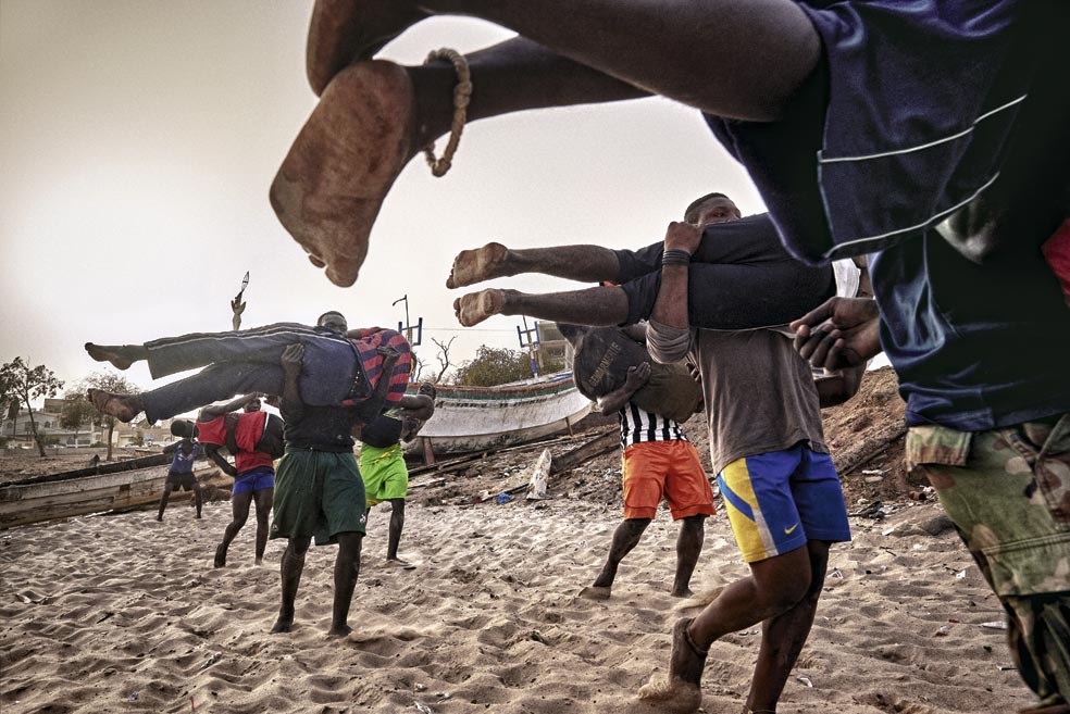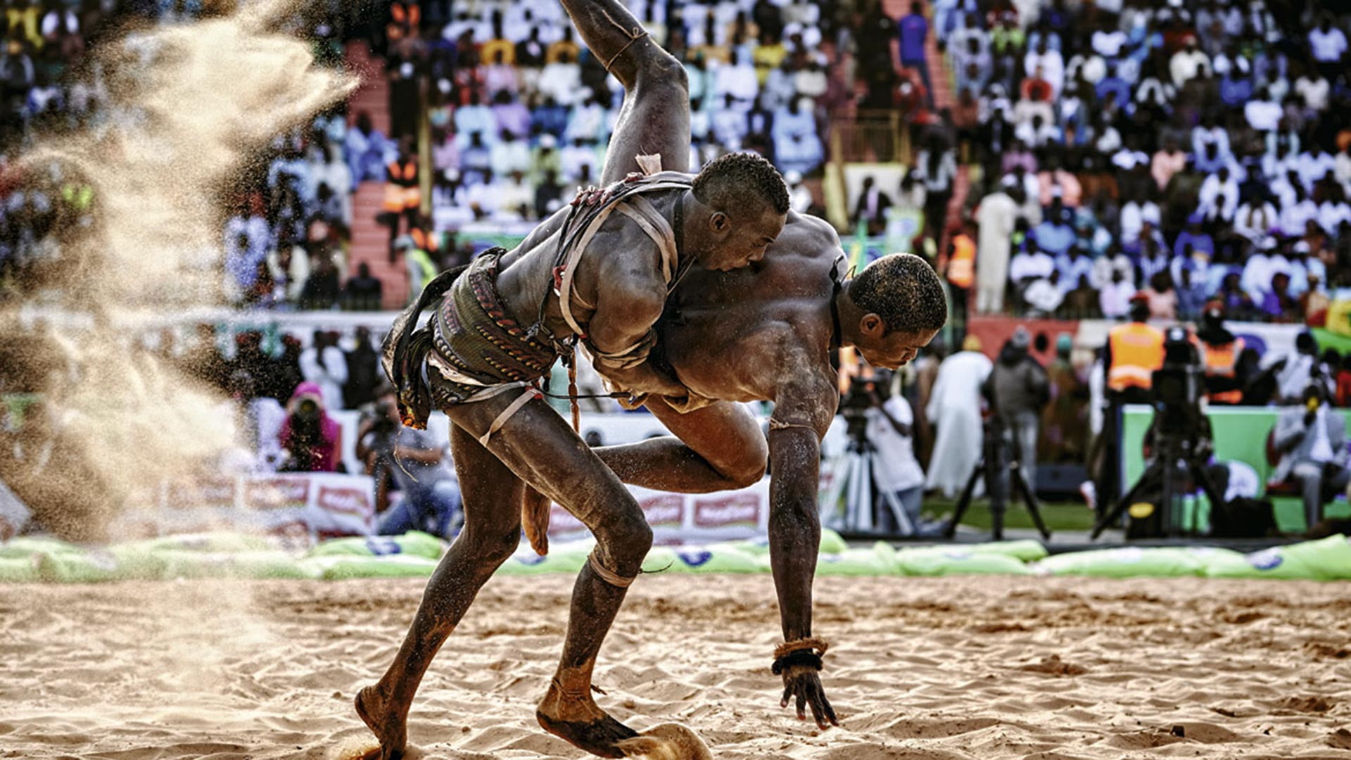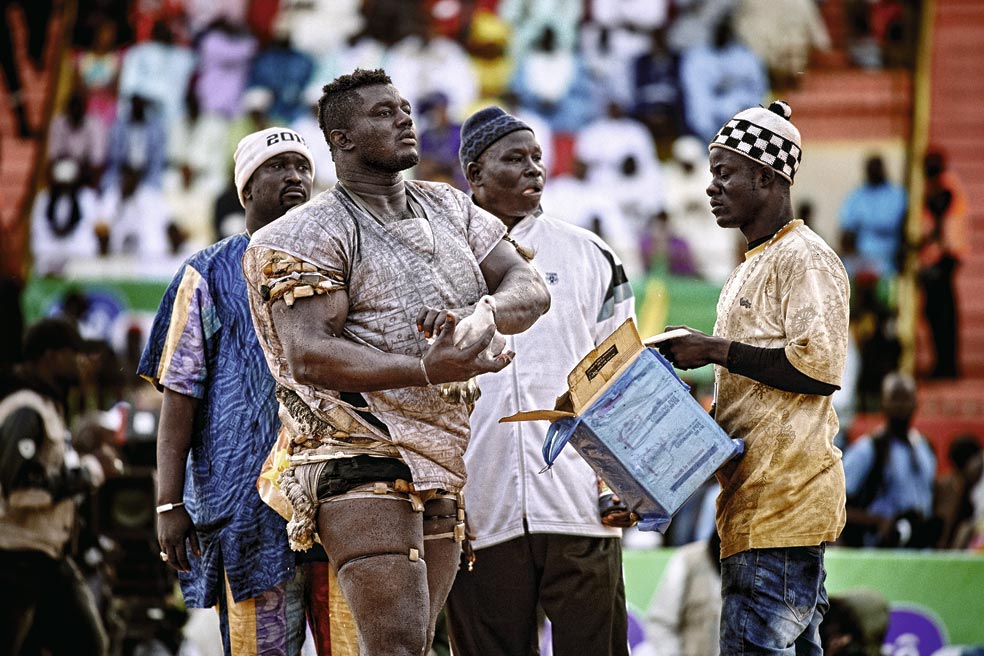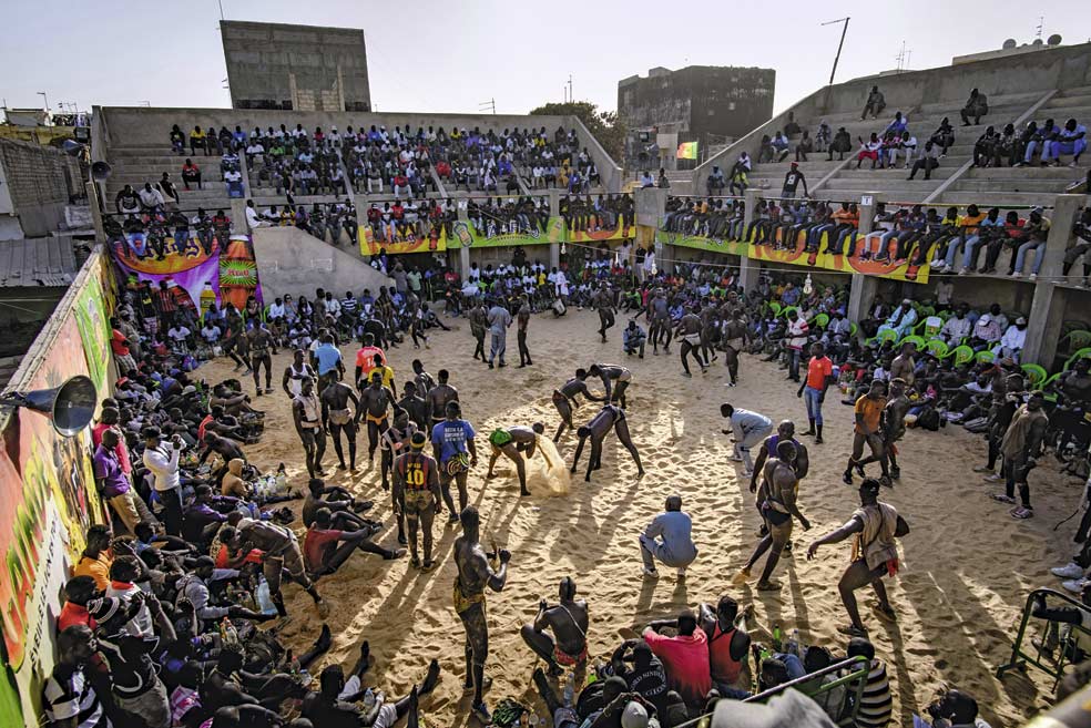 Un torneo en el estadio Adrien Senghor, de Dakar. Debido al calor, las competiciones tienen lugar al atardecer y se prolongan hasta la medianoche. Los mejores combates se celebran coincidiendo con las fiestas nacionales.