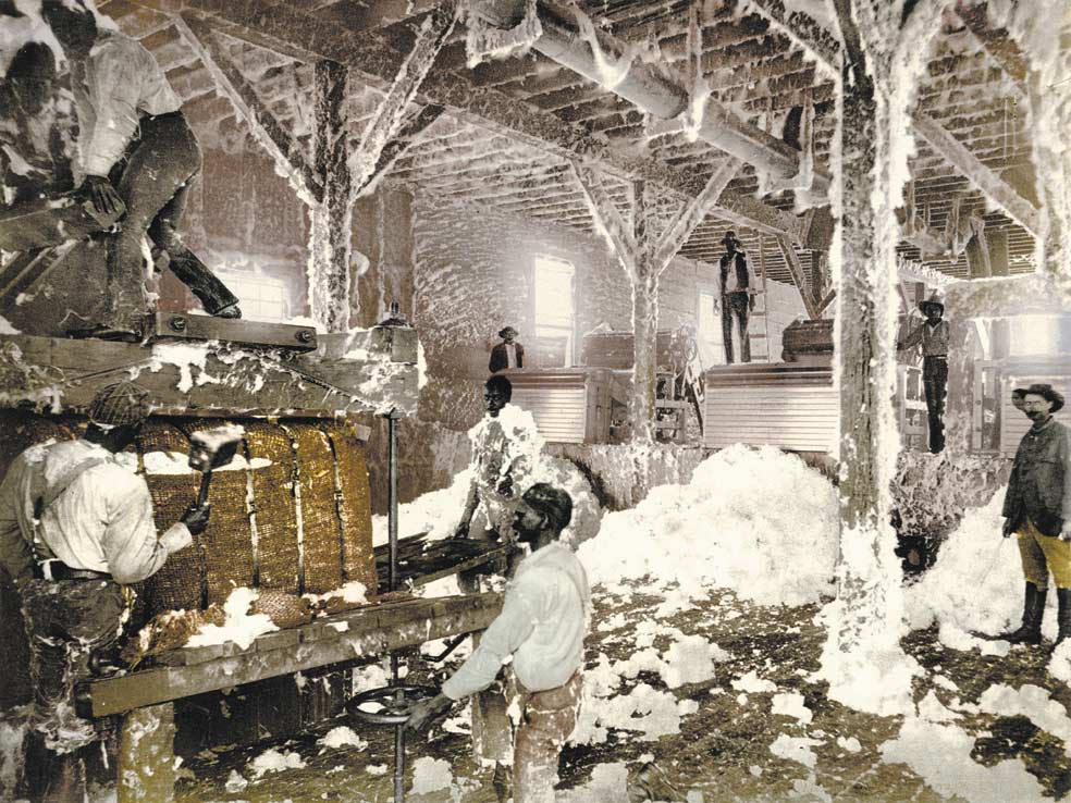 La desmotadora es una máquina que separa la fibra de las vainas de algodón y de sus pegajosas semillas. Los esclavos de plantaciones como la ... de Dahomey (Misisipi) acababan la jornada convertidos en una especie de muñecos de peluche. Su esfuerzo, operando estas máquinas, dio un poderoso impulso a la economía de EE.UU.