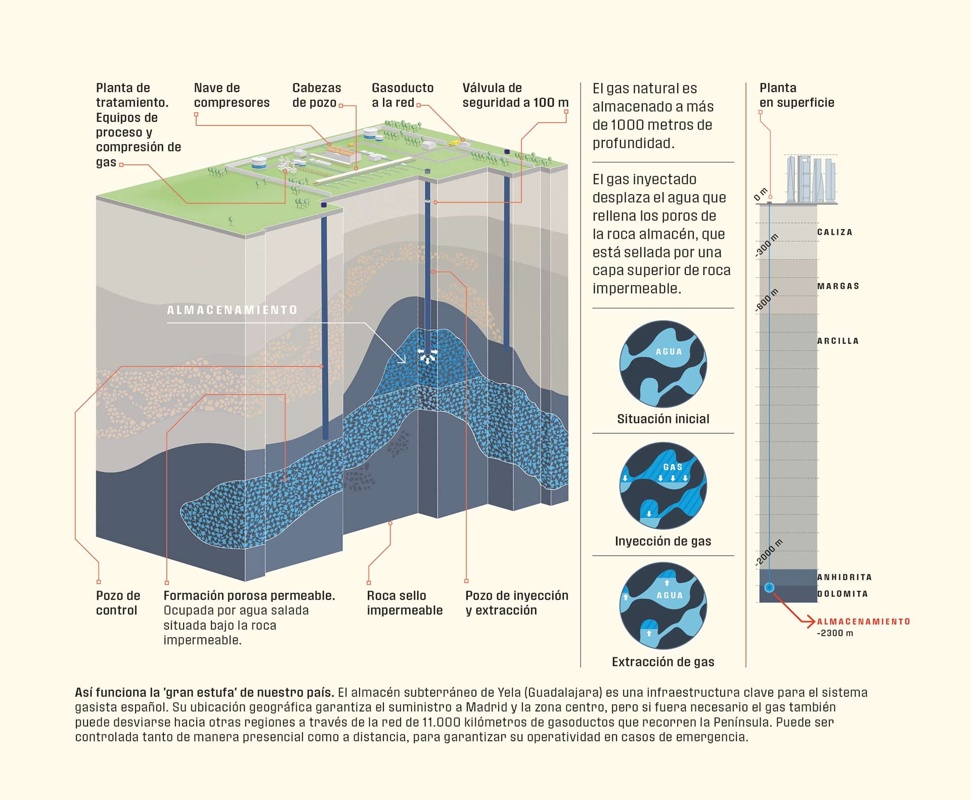En el peor de los escenarios tendríamos que echar mano de las reservas estratégicas. Existe una infraestructura crítica muy poco conocida. Está en mitad de la meseta castellana, rodeada de campos de cultivo. Se trata del almacenamiento subterráneo de gas natural de Yela (Guadalajara). En caso de emergencia, es la estufa que debe mantener caliente a media España en los meses más crudos del invierno. En superficie no parece gran cosa: una discreta instalación junto a los campos de lavanda de Brihuega, pero a 2300 metros de profundidad alberga un acuífero salino. En verano se le inyecta el gas comprimido que servirá para tener un colchón con el que garantizar el suministro nacional; y en invierno, a medida que se va vaciando, el agua vuelve a recargar el acuífero. El pasado enero fue el temporal Filomena el que puso a prueba por unos días el sistema gasista español, que tuvo que echar mano de reservas equivalentes a día y medio de consumo para afrontar las intensísimas nevadas. Yela es uno de los tres almacenes de emergencia de los que dispone España, todos gestionados por Enagás. Y es vital por su ubicación en el centro del país. Los otros son sendos yacimientos agotados que se rellenan periódicamente: Serrablo (Huesca) y Gaviota, en el mar Cantábrico. Las reservas serían mayores si no se hubiese producido el fiasco del almacén Castor, en el Mediterráneo, descartado por los seísmos que produjo.