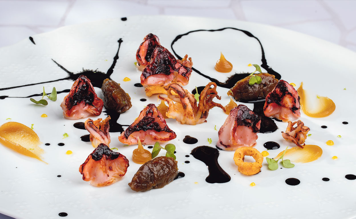 Pásale un papel a la sartén y en el aceite restante tuesta, vuelta y vuelta, los cuerpos de chipirón, sin amontonar, que se doren y queden ligeramente cru-dos en su interior, sin pasarlos de punto. Sube el fuego, agrega los tentáculos y las lengüetas, menea para que cojan calor, esparce el perejil y, justo antes de sacar del fuego, rocíalo con un poco de zumo de limón. Coloca los chipirones sobre la base y remata con el jugo que quedará en el fondo de la sartén.