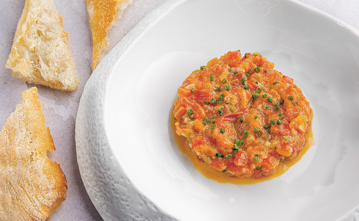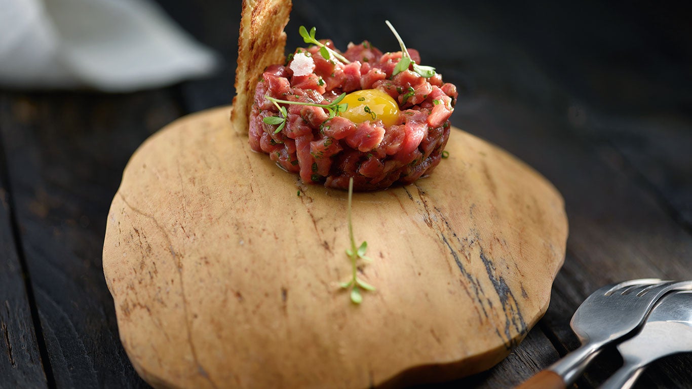 Para servirlo, lo acompañamos con pan tostado, colocando en el centro del plato la carne de manera delicada, sin amontonarla demasiado ni haciendo que parezca un plastrón. Y a la hora de hermosearlo aún más, colocamos en el centro una yema cruda de huevo de gallina o, si lo emplatamos en raciones más menudas, con yemas crudas de huevo de codorniz, más chicas. Espolvoreamos una pizca de cebollino picado.