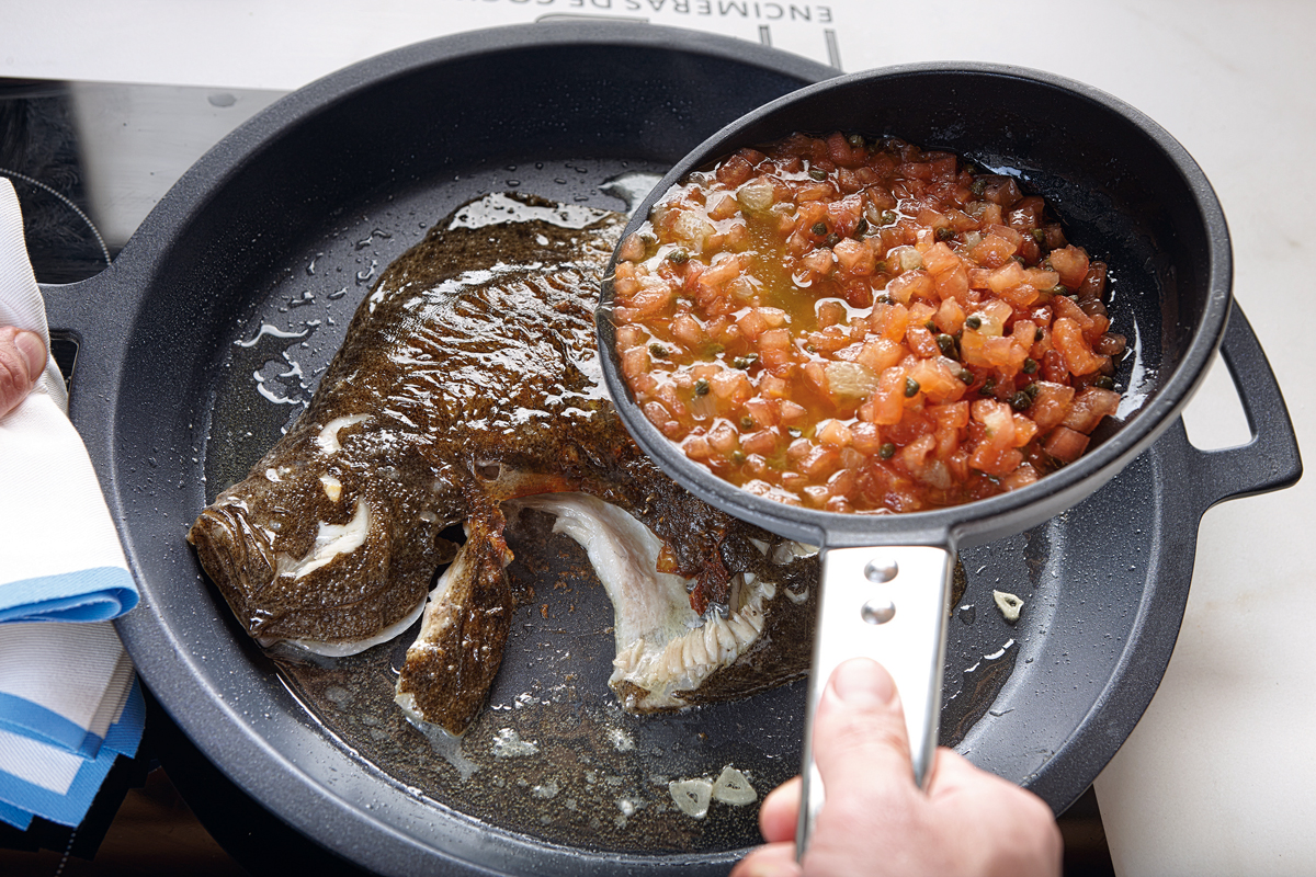 4. Acabado y presentación: se recupera la mezcla del refrito con el zumo de limón, vertiéndola en otra cazuela o sartén, y se vuelve a echar sobre el rodaballo. Se repite la operación tres veces más, las dos últimas añadiendo la mezcla de tomate, alcaparras y limón. Se sazona, se espolvorea con perejil y se sirve.