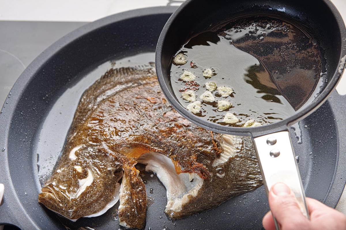 2. Del rodaballo: se marca el pescado por sus dos caras en una sartén antiadherente: once minutos por la parte oscura y diez por la blanca. Mientras se hace el rodaballo, en una sartén aparte se prepara un refrito con el aceite, los ajos y la cayena. Cuando el ajo comience a bailar y haya adquirido un bonito tono amarillo, se vuelca el contenido de esta sartén sobre el recipiente en el que estamos haciendo el rodaballo.