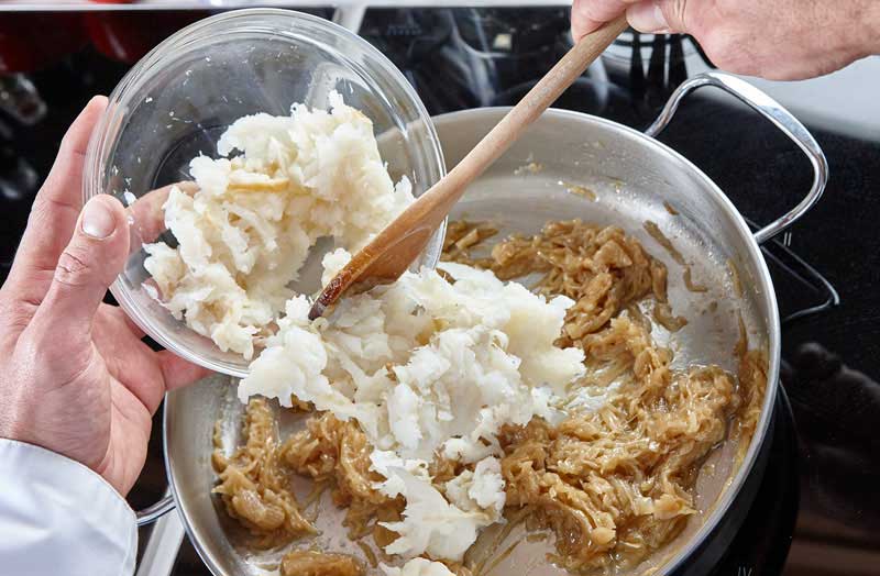 Cuando la cebolleta está bien cocinada, añadimos el bacalao desmigado sobre el sofrito y removemos.