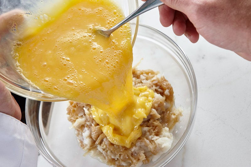 Una vez listo el sofrito, añadimos los huevos batidos y mezclamos.