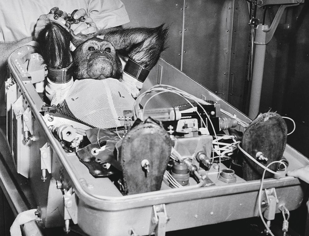 Ham fue el primer chimpancé en el espacio, el 31 de enero de 1961, dos meses antes del primer vuelo orbital del ruso Yuri Gagarin. Adiestrado con golosinas y descargas, a modo de premio o castigo, su viaje duró 16 minutos. Se elevó 253 km y experimentó 7 minutos de ingravidez y una desaceleración bestial en la reentrada. Pasó el resto de su vida en un zoo.