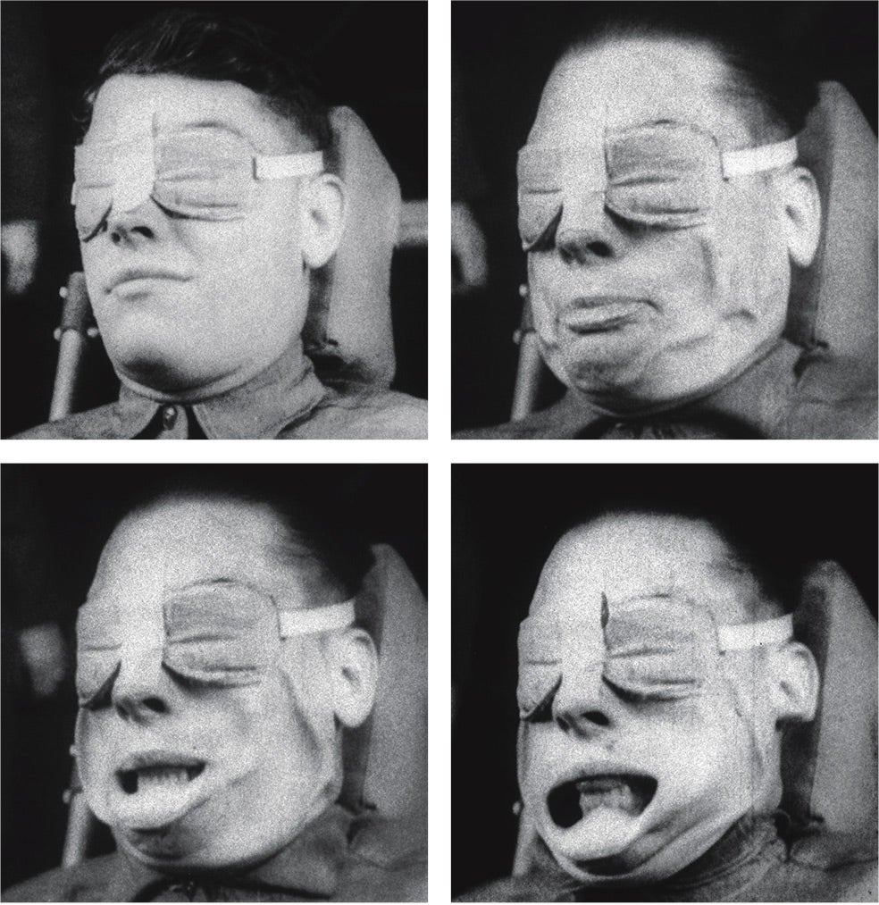En 1947, EE.UU. ya pensaba en vuelos suborbitales. La Fuerza Aérea estudió la tolerancia a las brutales aceleraciones de los cohetes. La secuencia muestra ... la reacción humana a una fuerza más de dos veces superior a la que los astronautas soportan en el despegue.