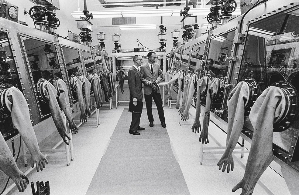 En esta sala guardaron las rocas lunares, en cámaras de nitrógeno, a salvo de la corrosión del oxígeno de la Tierra. Mientras Neil Armstrong y Buzz Aldrin paseaban por nuestro satélite hace 50 años, Michael Collins (de frente) se quedó en la nave. Su papel como piloto del módulo de mando fue clave en la misión del Apolo 11. Con formación científica, antes participó en el desarrollo del Laboratorio de Recepción Lunar, donde los tres pasaron la cuarentena a su regreso.