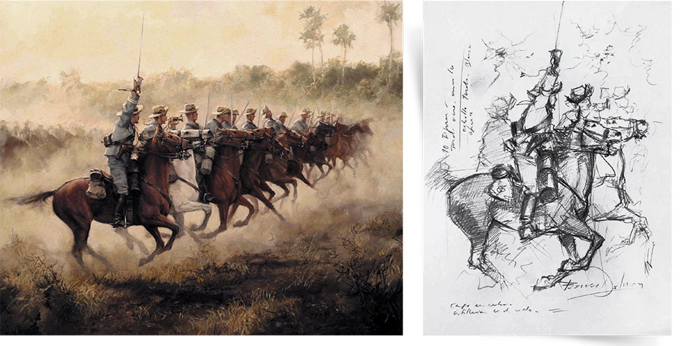 «Este es uno de mis primeros cuadros de pintura militar —cuenta Augusto Ferrer-Dalmau—. Retrata el momento justo del arranque de una carga de caballería en la guerra de Cuba. El corneta monta un caballo blanco para que lo pueda localizar el oficial y darle las órdenes que debía transmitir a los demás. Solo el caballo del corneta era blanco o tordo».