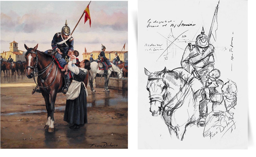 «No todo es guerra. También hay familias, ternura, sentimientos... Aquí, un soldado del regimiento Farnesio se despide de su mujer y su hijo. Va a la guerra de África de 1860. Es una secuencia tierna», explica Augusto Ferrer-Dalmau. Tras la documentación, el artista realiza un esquema de la estructura de sus cuadros; luego dibuja bocetos de los personajes principales; el último paso en sus obras es la aplicación del color.