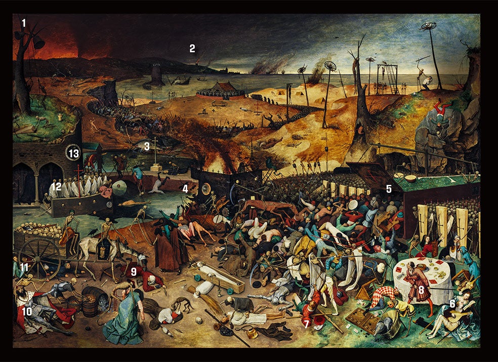 6. La muerte: «La muerte es un tema muy de la época porque era una presencia constante: los niños morían al nacer, había peste, guerras… Este es el cuadro de Bruegel más oscuro y pesimista con diferencia. Aquí no hay salvación ni Dios; esto es definitivo: llegan los ejércitos de la muerte y se llevan toda la vida al infierno».
