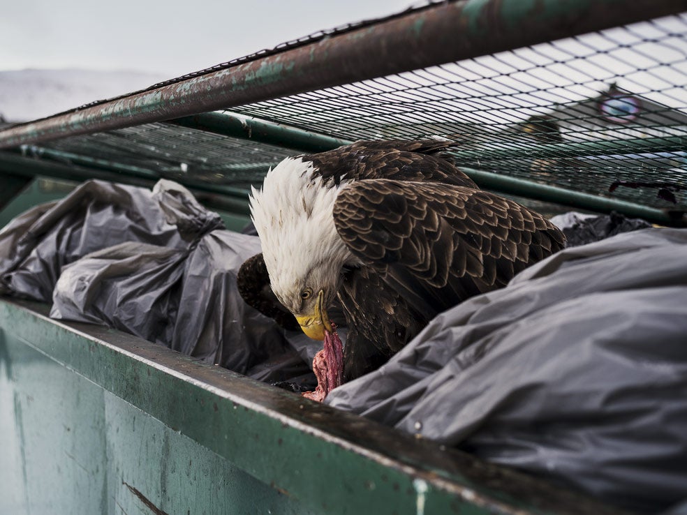 Un águila calva busca comida en un contenedor de Dutch Harbor (Alaska). Las águilas calvas estuvieron en peligro de extinción hasta que el Gobierno de los Estados Unidos las declaró 'ave nacional'. Desde entonces han proliferado en pueblos como este, donde ya las llaman sus 'palomas'. Pero, a falta de un hábitat natural adecuado, tienen que alimentarse de basura.