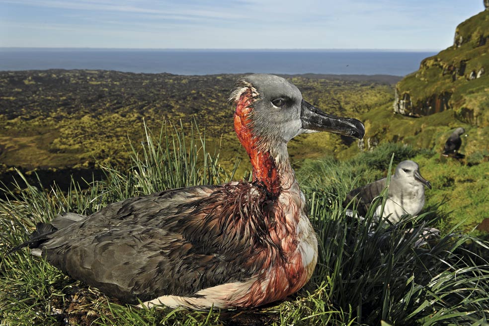 Un albatros de cabeza gris muestra las heridas provocadas por los ratones de la isla Marion, en el territorio antártico sudafricano. Los ratones llegaron con los barcos balleneros en el siglo XIX y fueron ganando tamaño y osadía. Con la erradicación de los gatos de la isla en 1991, el número de roedores se multiplicó. Necesitaban nuevos alimentos y los albatros empezaron a ser atacados.