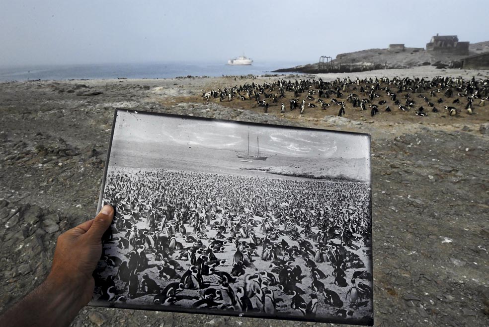 Entre las dos fotografías han transcurrido 120 años. La colonia de pingüinos de la isla Halifax, en las costas de Namibia, contaba en 1890 con más de 100.000 aves. Era la más numerosa entre las aves marinas del cono sur africano. Hoy, apenas el 25 por ciento sobrevive. La sobrepesca ha hecho desaparecer las sardinas y las anchoas, que son la base principal de la dieta de los pingüinos africanos.