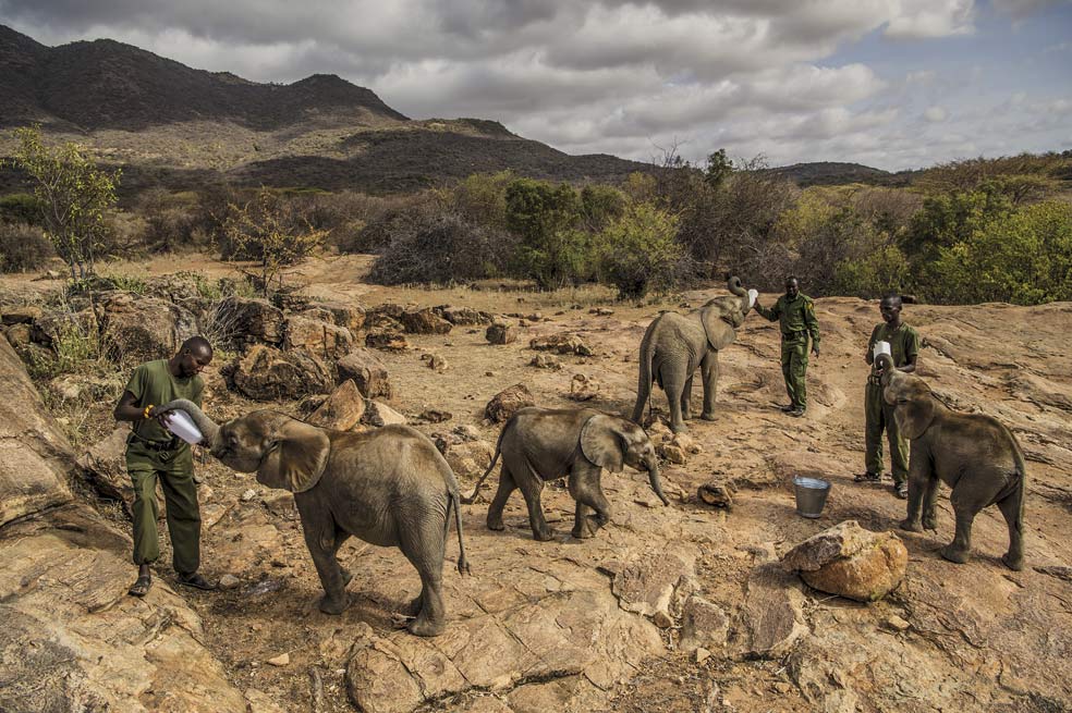 Un grupo de voluntarios de la tribu samburu cuida de elefantes huérfanos en el Reteti Elephant Sanctuary (Kenia). Los samburus han encontrado en los paquidermos unos aliados para abrir el terreno que necesita su ganado. Los elefantes acaban con los arbustos y dejan espacio a los pastos que precisan. Antiguos competidores por el terreno, hoy se han convertido en aliados.