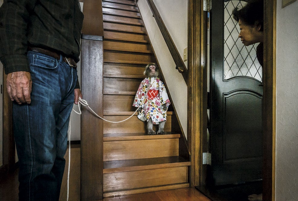 Un macaco, tratado como mascota, en Pta- Shi, Japón. Los macacos, o monos de la nieve, salieron de las montañas e invadieron los cultivos. Fueron tachados de plaga. Solo su uso tradicional como mascotas y animales para entretenimiento los salva del exterminio. Desde hace mil años, macacos amaestrados divierten a la población como marionetas vivas.