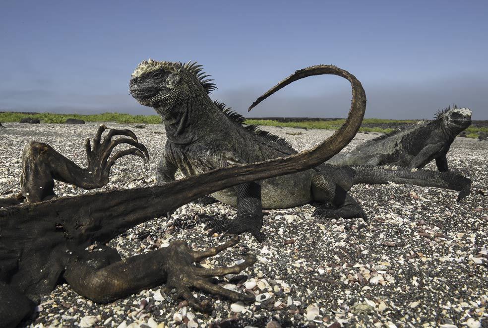 Las iguanas contemplan los restos momificados por el calor de un congénere. Las islas Galápagos cuentan con una riqueza natural única por la convergencia de cuatro corrientes oceánicas. Sus ecosistemas son muy sensibles a los cambios climáticos que arrastran fenómenos como El Niño y La Niña. Estos provocan una terrible mortandad entre las más de 7000 especies de plantas y animales.