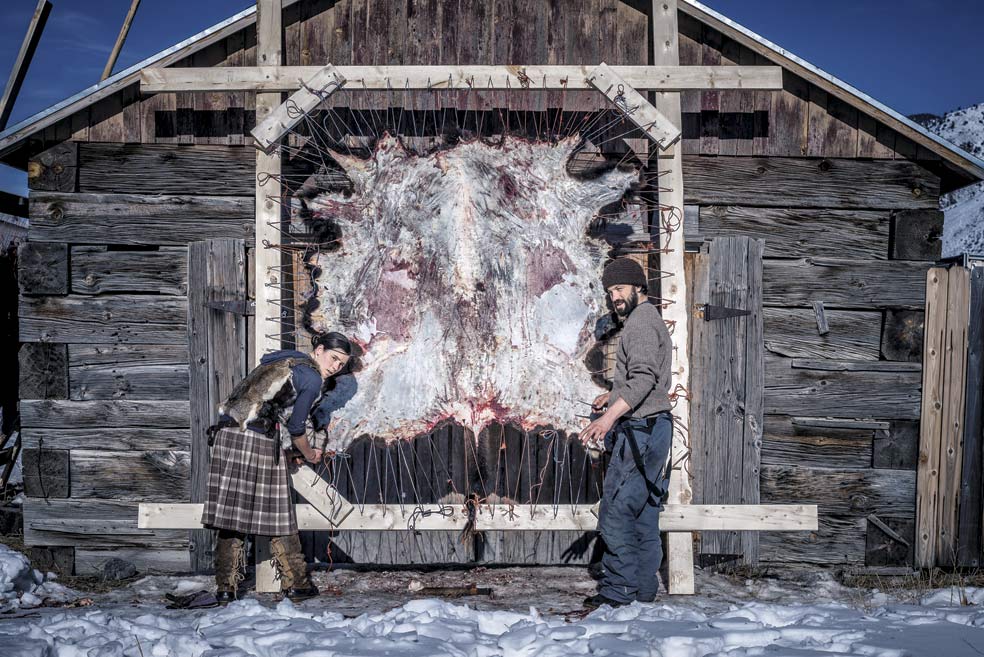 Para curtir la piel del bisonte, extienden con los pies una pasta hecha con los sesos del animal. Después la ahúman para ablandarla y que dure más.
