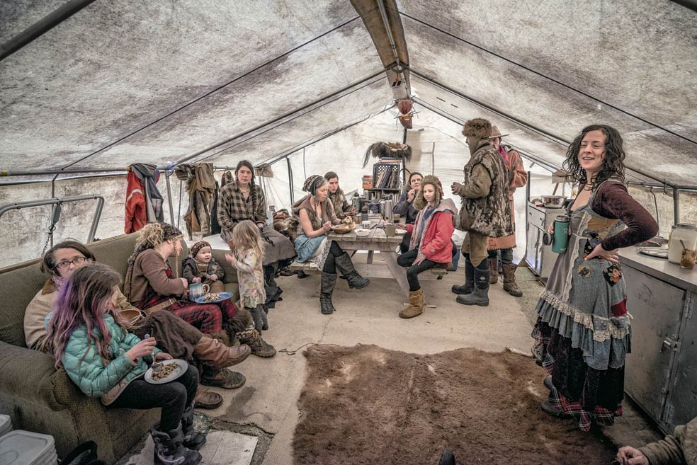 Las familias de Buffalo Bridge viven sin agua corriente. Sí tienen electricidad porque venden sus pieles por Internet. En la foto, en la tienda comunal donde se reúnen para comer. Mientras los ecologistas se oponen a la caza de bisontes y exigen la creación de zonas protegidas más grandes, los ganaderos quieren reducir las poblaciones de este 'tanque con pelo', al que acusan de comerse los pastos reservados para sus vacas.