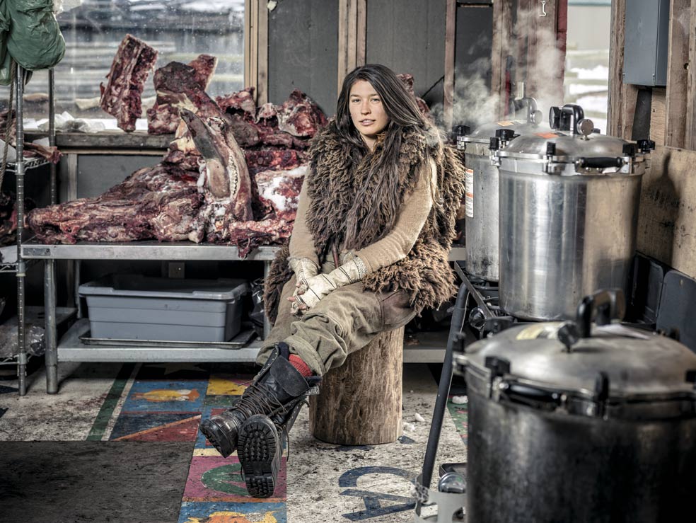 Sacan la vejiga del bisonte, la vacían, la inflan y después la utilizan como bolsa. En la foto, la carnicera Hari Ronkin a punto de comenzar el proceso de conservación. Sus pantalones, chaquetas y gorros se los han hecho con la piel y el cuero de los búfalos (como llaman los americanos a los bisontes).